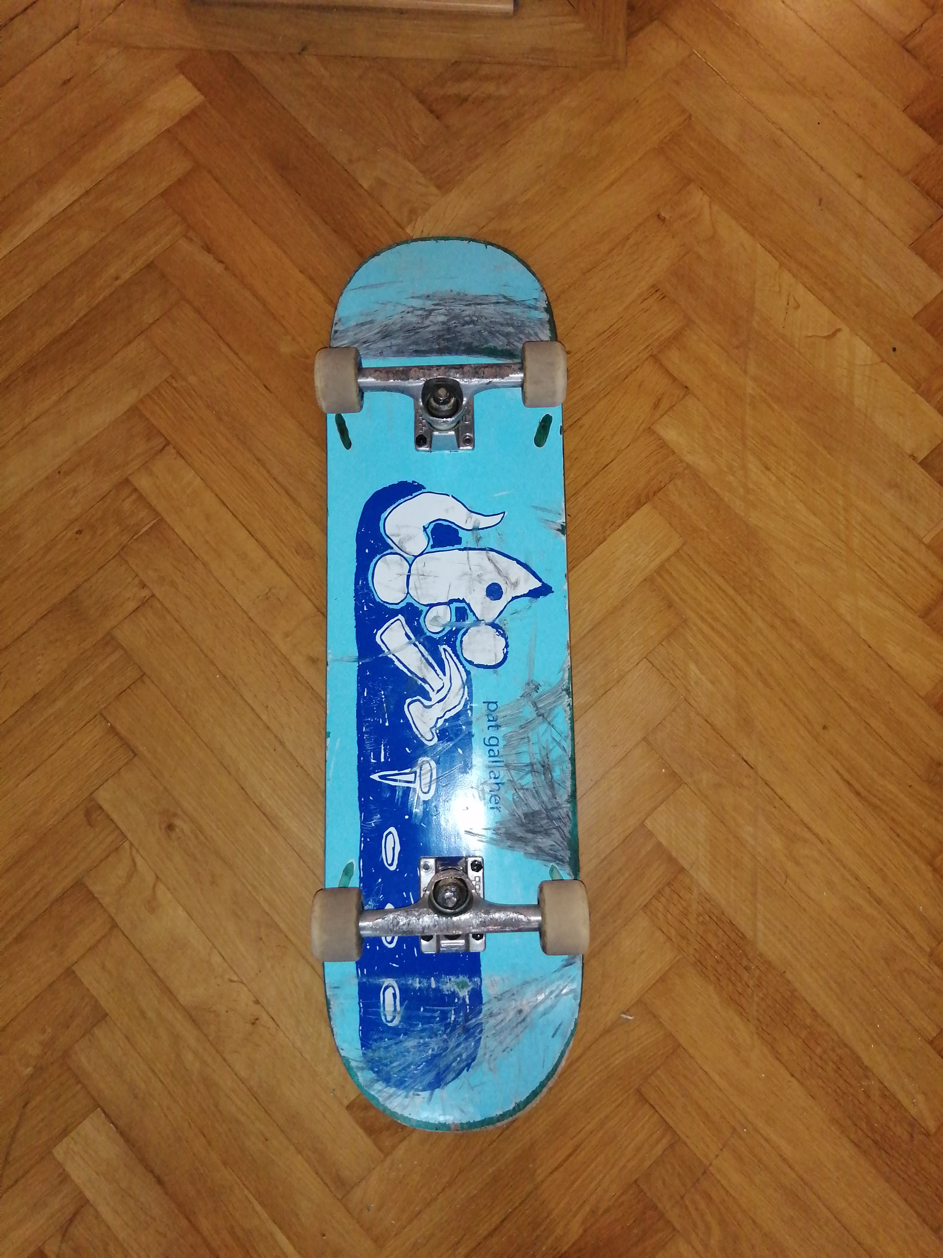 Deck: Frog 8.5 Achsen: Ace AF1 55 Wheels: Spitfire conical Full 56mm Kugellager: Bone big balls Griptape: Jessup Preis ist VHB