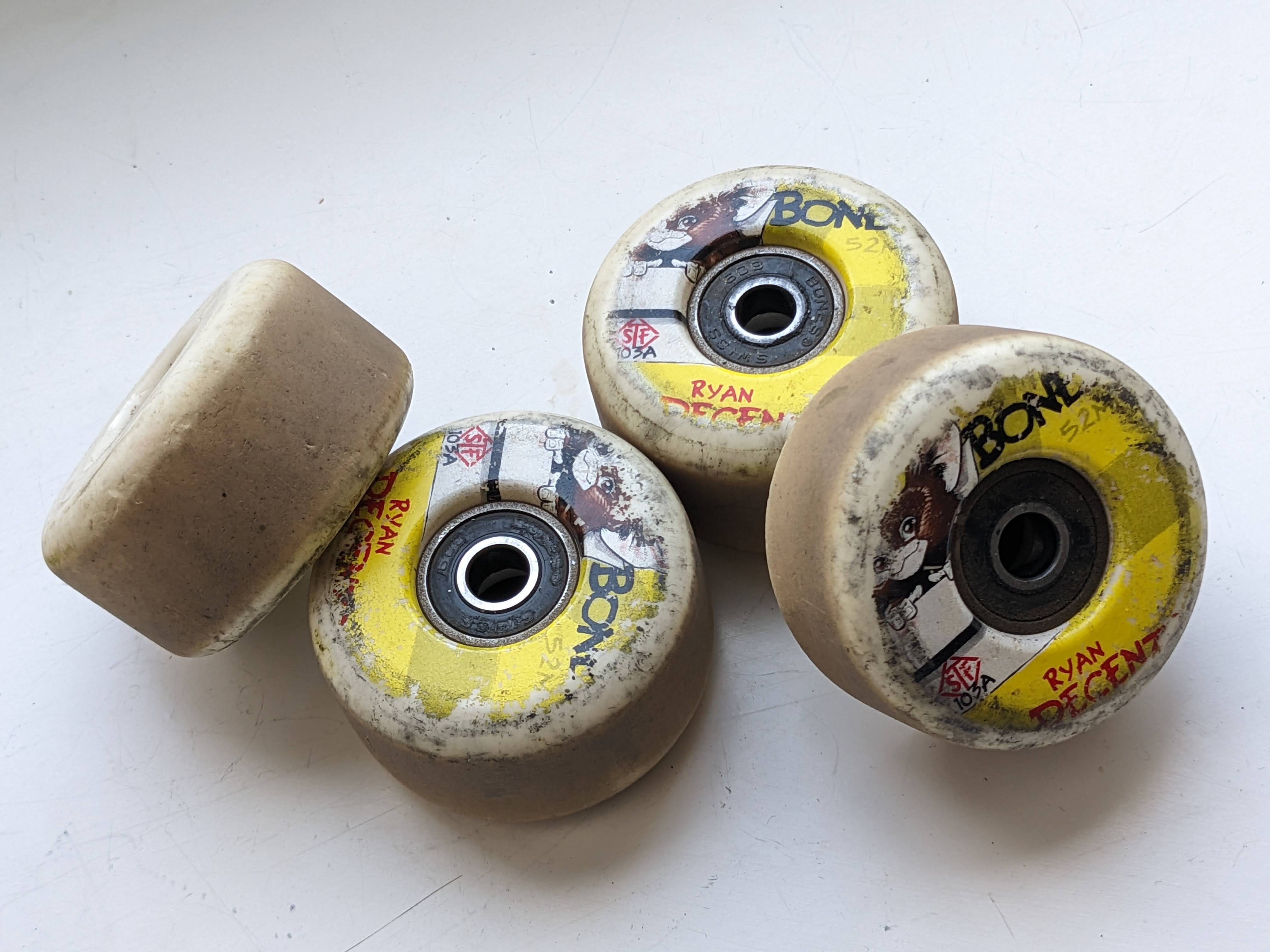 Bones 52mm wheels, 103a STF street formula. Ryan Decenzo pro wheels. No flatspots, not coned. These are the V2 "Locks" profile -- pretty flat sides, meant to be better for locking in grinds. Comes with Bones Swiss bearings. Bearings and wheels are great -- they're still fast, and if you clean them regularly they'll be even better with time. This price is good and the condition is great. These are hard, if you're looking for slightly softer wheels I have another listing with 92a's. Can meet you at Loretto Plaza or Nordbrücke. If you'd like these by Post, check later and I'll have a Willhaben link where you can pay by Paylivery.
